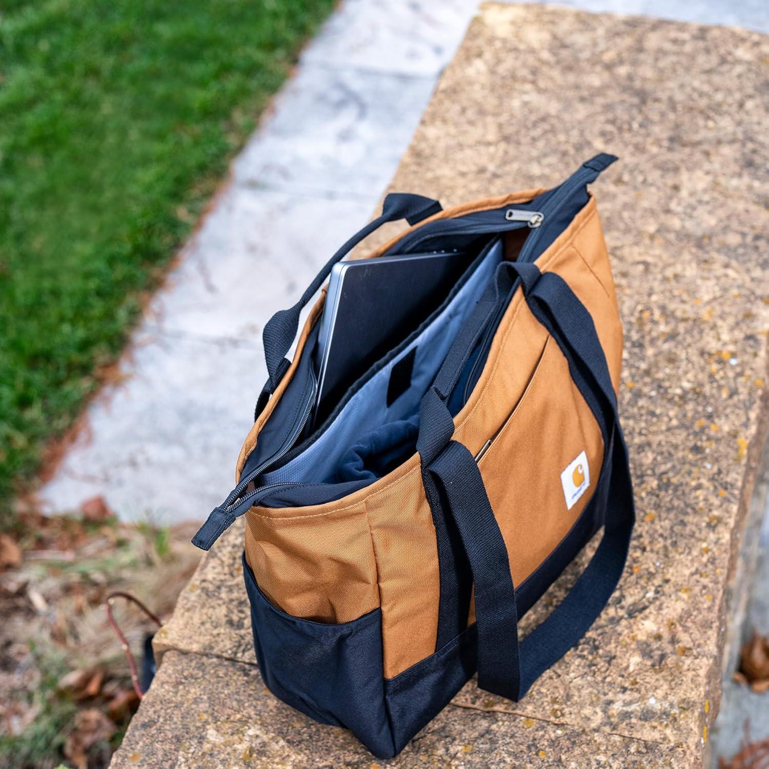 The Carhartt Horizontal Zip Classic Laptop Tote combines rugged durability and thoughtful design to keep you organized on the go. Made from 600 Denier Rain Defender polyester, this tote is built to resist the elements, ensuring your gear stays safe and dry, no matter the weather. The bag features a secure zipper closure, keeping your items protected during transit. Designed for versatility, it includes both hand and shoulder straps for multiple carrying options, whether you prefer to tote it by hand or sling it over your shoulder for comfort. Inside, you'll find a dedicated 17″ laptop sleeve to safely house your device, along with two additional pockets and an inner organizer to keep smaller items like pens, chargers, and business cards neatly arranged. The back slip pocket conveniently converts into a trolley sleeve, allowing the tote to easily slide onto the handle of your luggage for smooth, hands-free travel. Additionally, two stretchable side pockets offer extra storage space for water bottles, umbrellas, or other essentials.