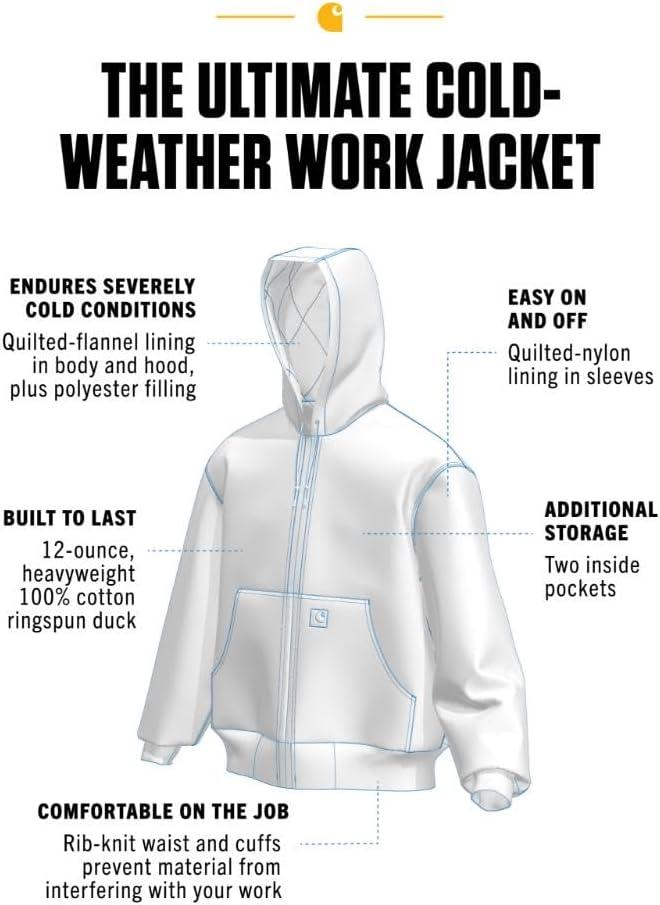 This Carhartt men's jacket provides serious warmth when you're working outside. The jacket is made of rugged cotton duck that shrugs off water and resists wind. The body and hood are flannel-lined.