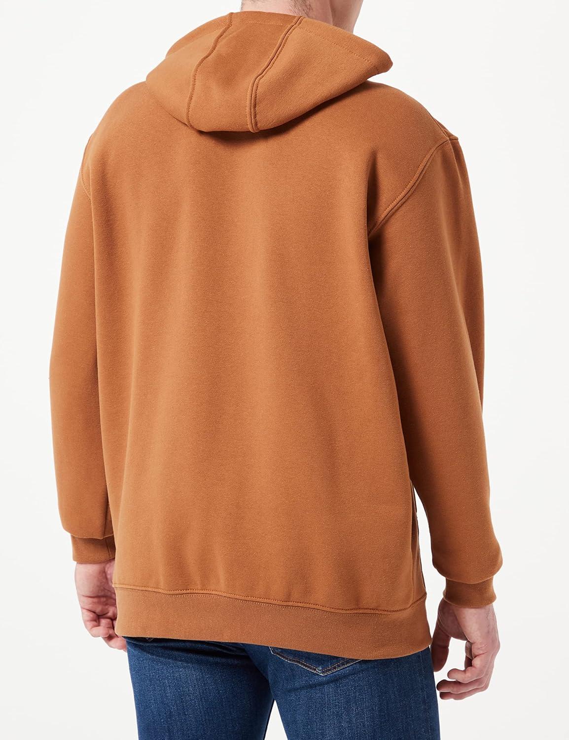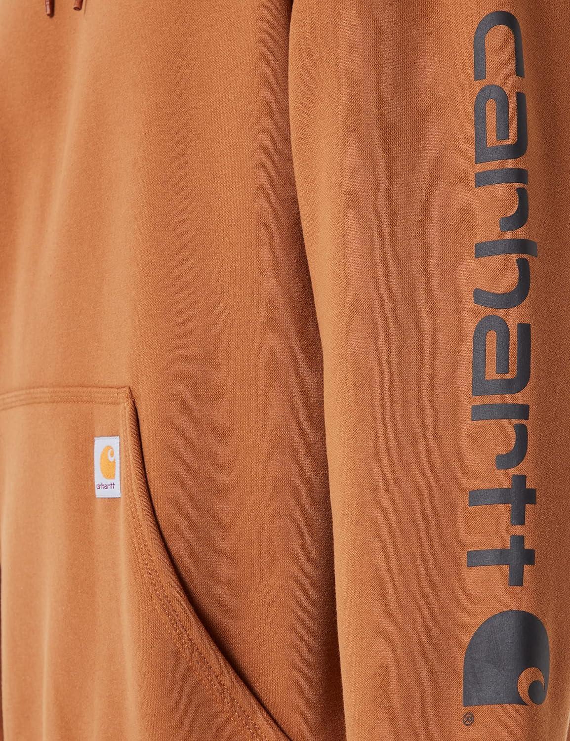 Carhartt's midweight hooded logo-sleeve sweatshirt comes in great colors. Made of a 10.5-ounce, 50% cotton/50% polyester blend, it features an attached hood with draw-cord closure, front hand-warmer pocket, spandex-reinforced rib-knit cuffs and waistband. The carhartt logo is printed on the sleeve and a logo patch is sewn on the pocket.