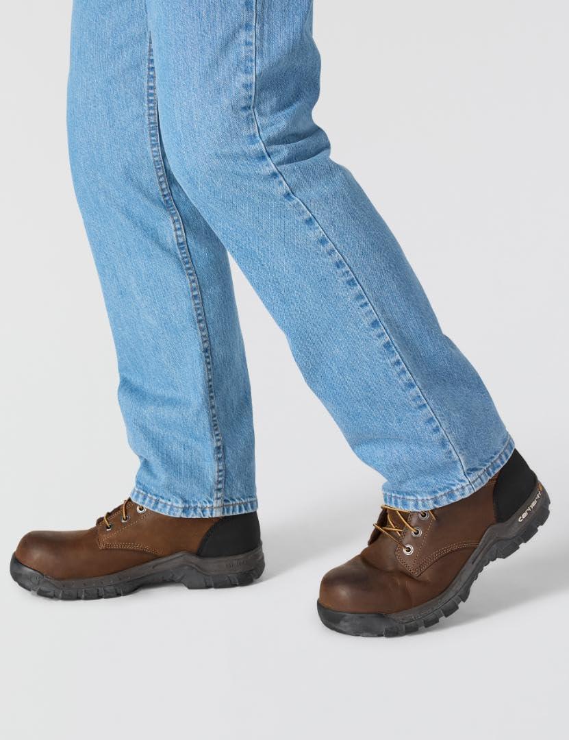 Durable midweight denim gives these men's Carhartt five-pocket jeans an everyday feel. Their relaxed fit offers a little extra room through the seat and thigh with a straight leg opening.
