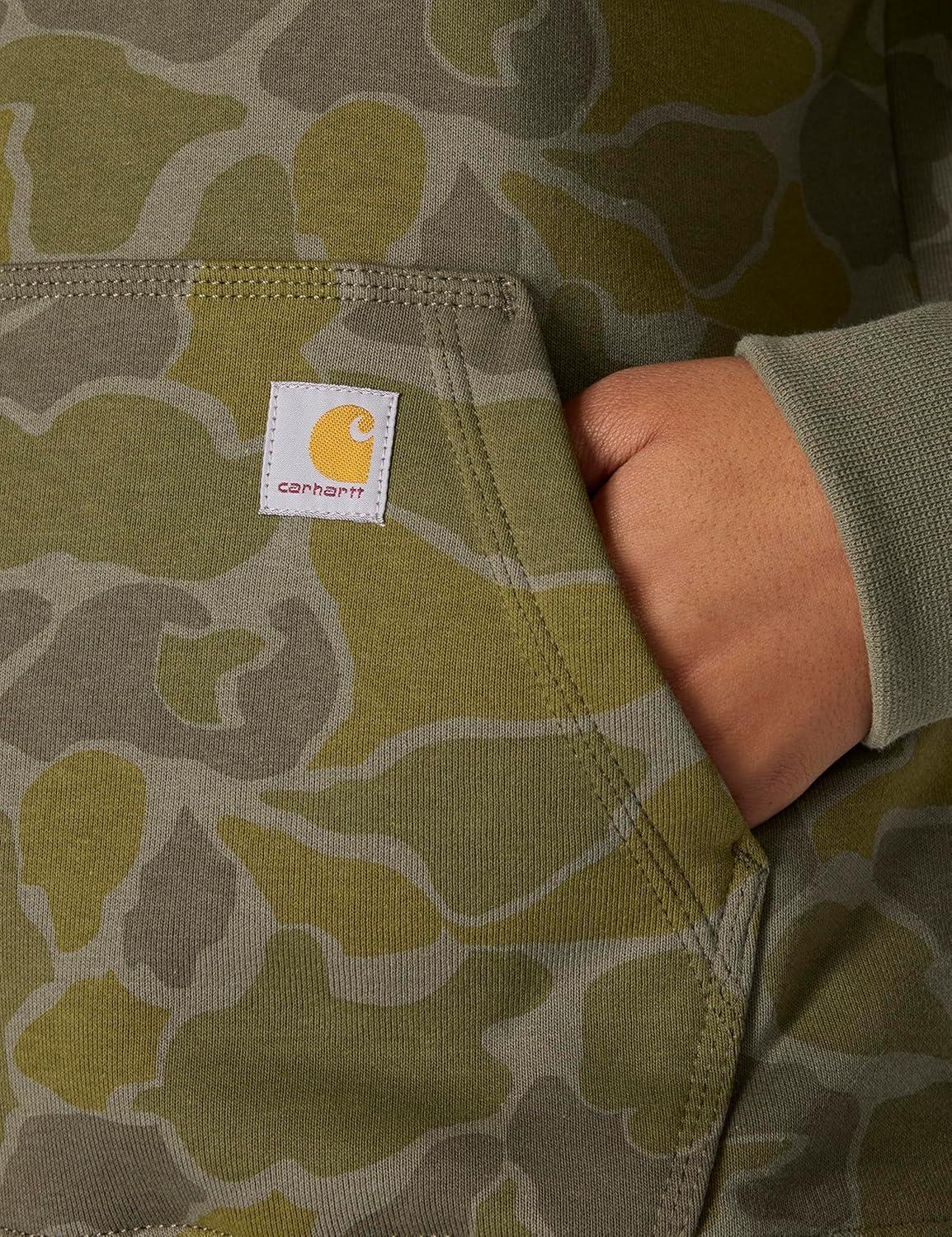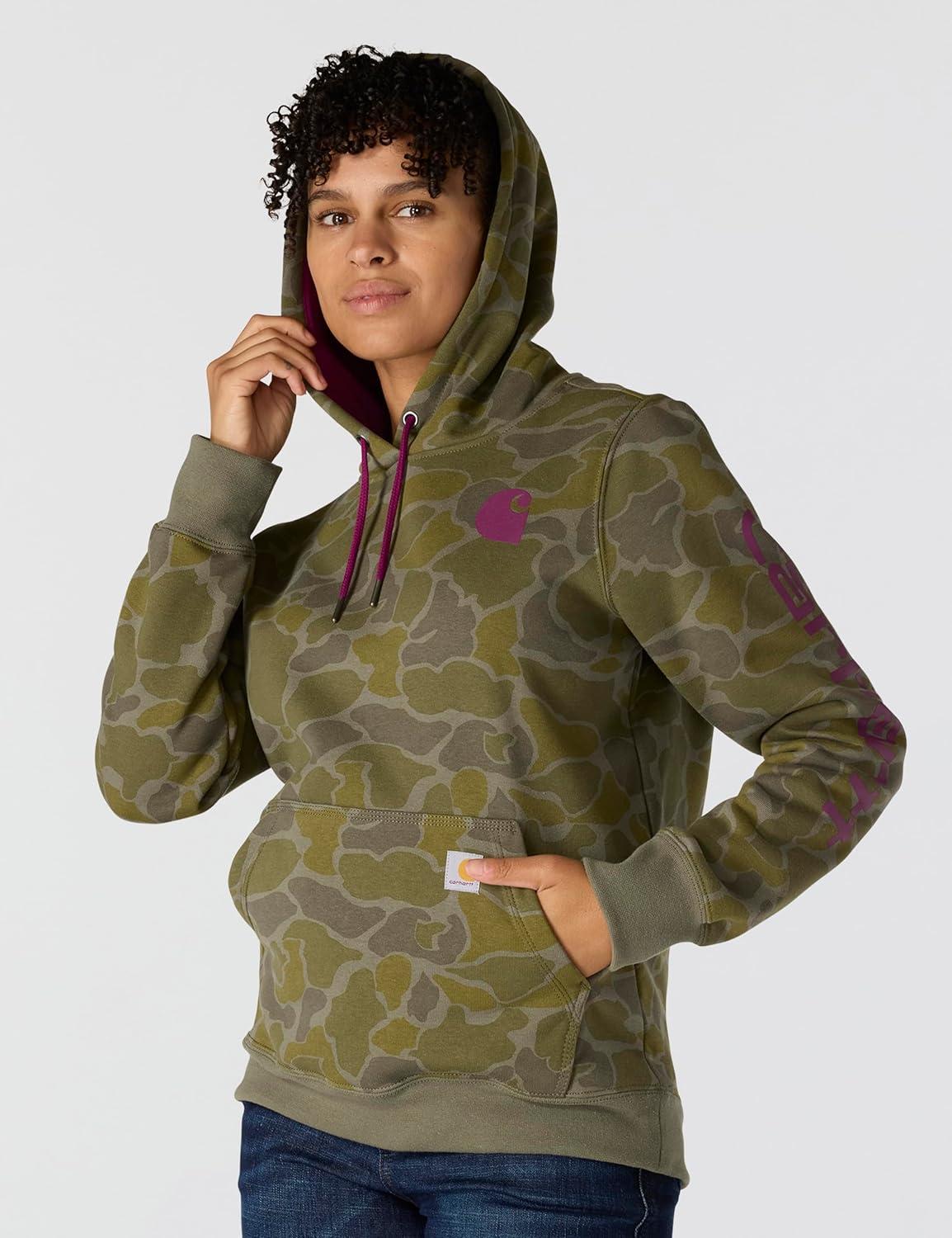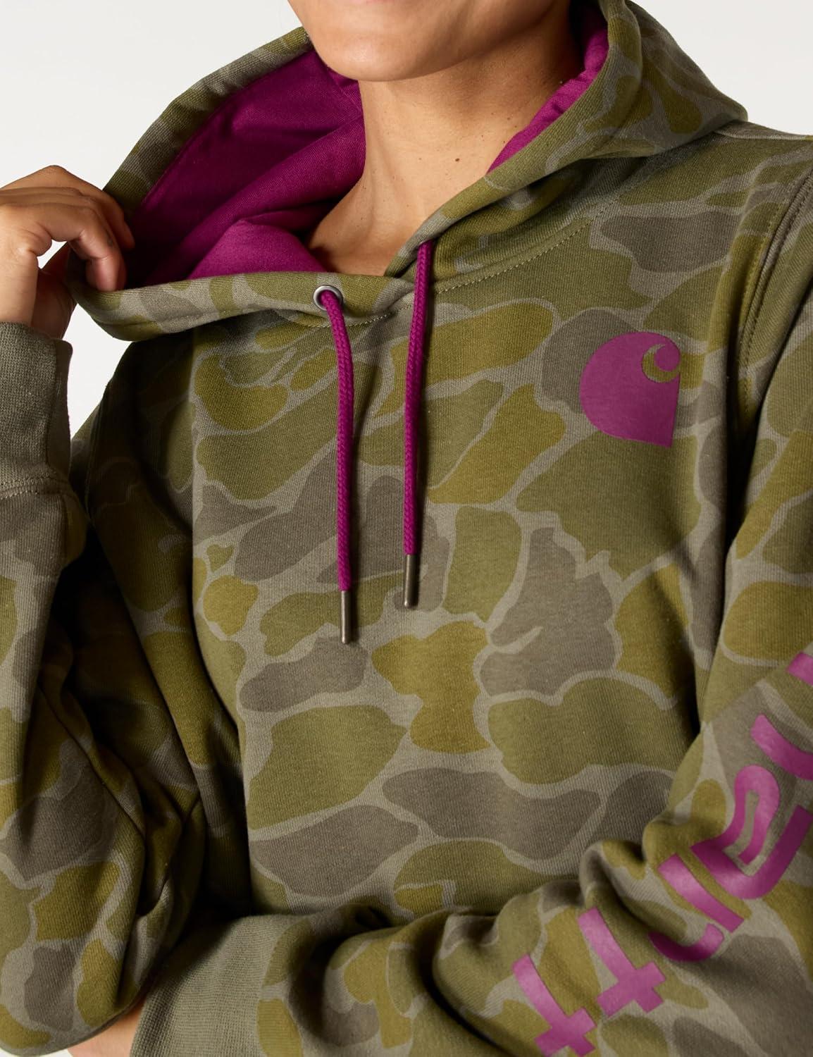 Carhartt Women’s Relaxed Fit Midweight Logo Sleeve Graphic Printed Sweatshirt(Dusty Olive Vintage Camo)