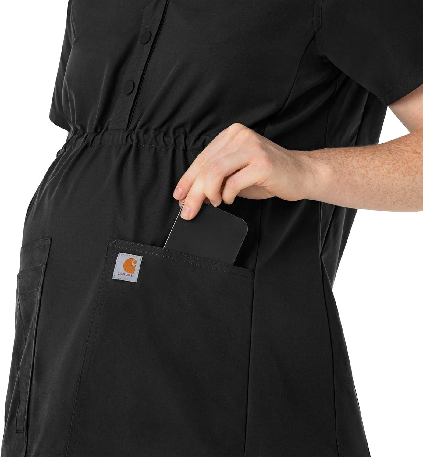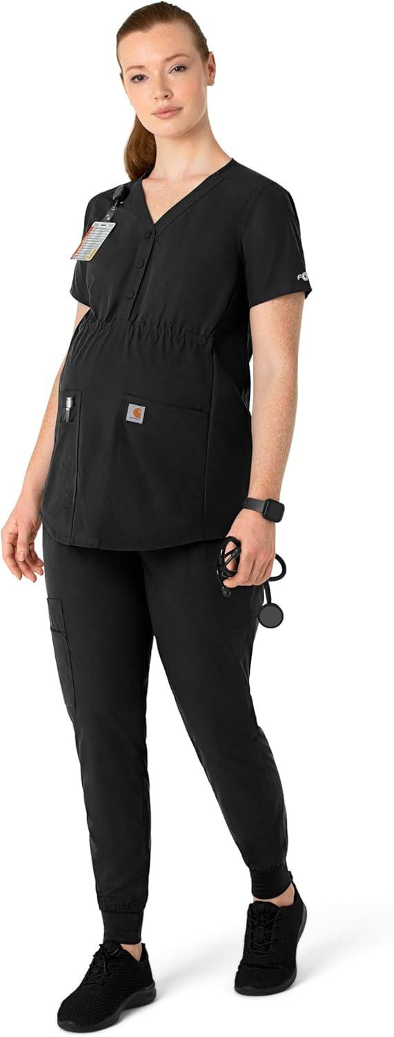 Experience comfort and practicality like never before with the Carhartt Force Essentials Henley Maternity Scrub Top. This top is designed to simplify your life, ensuring your focus remains sharp and your comfort stays strong throughout your pregnancy. Featuring two oversized top-loading front pockets, this scrub top provides ample space for larger essentials and daily must-haves. The addition of a smaller mesh pocket offers a convenient place to keep your phone, ensuring you always know where it is and have easy access when needed. The scissor pocket on your right keeps your must-have tool secure and within reach at all times. Designed for versatility, the adjustable elastic on the empire waist allows you to customize the fit as your belly grows. The curved hem creates a well-rounded silhouette, while the Henley neckline with a snap-button placket adds a touch of tailored style. Crafted with performance in mind, this scrub top is equipped with technologies that wick sweat, dry fast, and resist stains, keeping you looking and feeling professional throughout your shift.