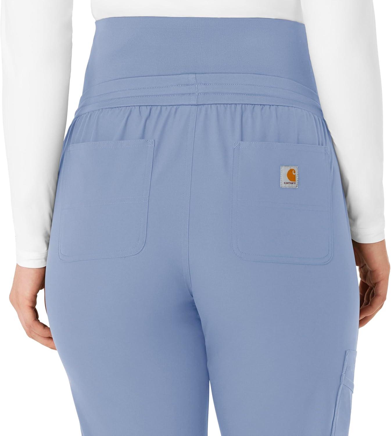 Introducing the Carhartt Force Essentials Maternity Jogger Scrub Pant, where extra comfort meets exceptional functionality. Designed to accommodate your growing belly, these maternity scrub pants ensure you stay comfortable during long shifts and busy clinic days. Featuring a knit elastic waist that expands with you, these pants offer a personalized fit with an easy-to-adjust drawstring. Two front slash pockets provide clean-lined style and on-the-go storage, while three cargo pockets, including a pen tack, offer even more room. Additionally, two back pockets provide further convenience. The jogger-style silhouette is enhanced by cozy knit cuffs, adding a stylish touch to these functional pants. Part of our Force Essentials collection, these scrub pants are equipped with technologies that help you perform at your very best. They wick sweat, dry fast, and resist stains, ensuring you look and feel professional throughout your shift.